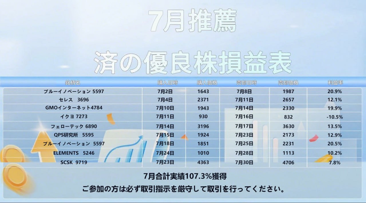 7月にお薦めした優良株損益表によると、弊社は投資家の皆様に優良株を推薦したり、共有した投資戦略の有効性と正確性が反映られ、全体収益率が107.3%を達成できました。 市場の値動きを把握し、今月はさらに下記のように多くの銘柄が短期的に高いリターンを達成しています。詳細については下記のとおりです。 1.ブルーイノベーション (5597) 7月2日に1643円で購入、7月8日に1987円で売却。保有期間が短く、利回りは20.90%に達しました。これは、市場の合理的な判断の下で、短期取引で大幅な利益を達成出来たことが裏付けられています。 2. セレス (3696) 7月4日に2371円で購入、7月11日に2657円で売却し、利益は12.10%を達成。この高いリターンは、株価が短期的に回復する能力が高いことも示しています。 3. GMOインターネット(4784) 7月10日に買値1943円で参入し、7月14日に2330円で売却し、19.90%の利益を上げました。この堅実な成長は、同社の比較的強力なファンダメンタルズを示しています。 4. イクヨ(7273) 7月11日に930円で購入し、7月16日に2330円で売却しました。最終的な損失は -10% となりました。 5. フェローテック (6890) 7月14日に3196円で購入し、7月17日に3630円で売却し、13.50%の利益を達成できました。これは、適切な市場環境下では、スイングトレードの運用が効果的に利益を獲得できることを示しています。 6. QPS研究所(5595) 7月15日に1924円で購入、7月23日に2173円で売却、利回りは12.90%。振幅は大きくありませんが、短期的な成長可能性を示しています。 7. ブルーイノベーション (5597) 7月18日に1851円で購入し、7月25日に2231円で売却しました。20.50% という安定した収益範囲のリターンを獲得しており、良好なリスク軽減の能力を示しています。 8. ELEMENTS(5246) 7月24日に1010円で購入、7月28日に1113円で売却、10.20% の上昇。この株式は堅実な短期から中期の保有戦略を反映しています。 9. SCSK(9719) 7月23日に4363円で購入、7月30日に4706円で売却、利回りは7.80%で、堅調な上昇傾向を示しています。 7月に当社が推奨した投資ポートフォリオは、全体的に非常に好調な成果を上げました。 選定した銘柄はすべてプラスの収益を達成し、優れた選定力と市場判断力を示す結果となりました。 投資家の皆様には、銘柄の長期的な価値を意識しつつ、市場の動きを踏まえて適切な売買タイミングを見極めることをお勧めします。 今後も弊社は、厳選した優良銘柄を提供し、安定した資産形成を全力でサポートしてまいります。 今後とも弊社の厳選された各種プロジェクトへのご注目とご参加を心よりお待ちしております。